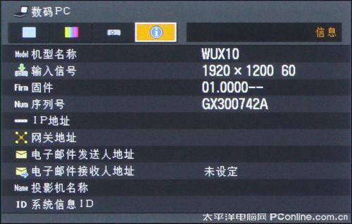 在信息选项里面我们可以查看到输入源的信号情况,投影机的型号、固件和序列号,如果机器接入到网络中,还可以查看到投影机的IP地址、网关地址、投影机在网络中的ID等,用户还可以设定电子邮件发送人和接收人的地址,当机器出现异常状态后会第一时间通过电子邮件的方式通知用户。