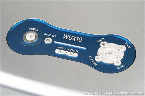 佳能WUX10机身亮银色按键手感颇为舒适,虽然按键键位较小,但分布比较合理,在控制过程不易出现误操作。按键从左到右分别是电源开关键、一键自动设置键、信号输入源设换键、电脑输入自动调整键、方向键、对焦键、放大缩小键、梯形校正键、菜单键和确认键。