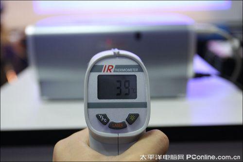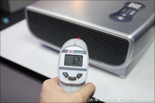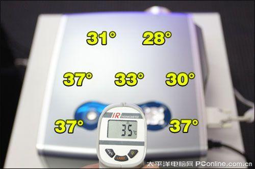 佳能WUX10整机密封性非常高,没有设置进风口,所有冷风均是通过机身底部进入机器内部然后排出,从机身表面温度分布情况来看,机身温度最高部位仅仅是37°,热量并不算高。佳能WUX10还有一个优点就是在演示结束后,即使拔掉电源线,由电容器供电的风扇也可以继续工作,直到使灯泡温度降到预设安全范围,当然,一台价格如此之高的投影机我们还是需要好好爱护的,建议用户不要每次结束演示后都马上拔除电源。