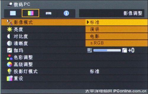 影像调整设置选项可以设置影像模式、投影机亮度、对比度、清晰度、伽玛值等。