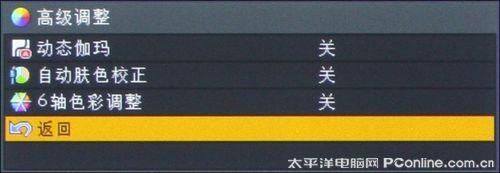 在影像调整设置的高级选项中,用户可以开启或关闭动态伽玛功能、自动肤色校正功能和6段色彩调整功能。