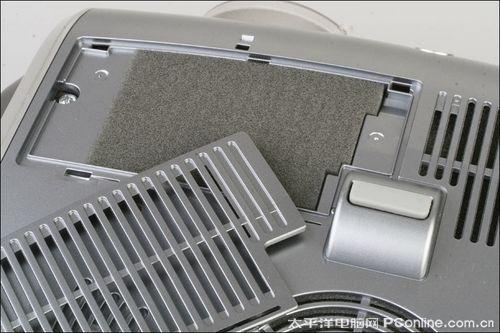 由于佳能WUX10没有设置进风口,所有冷风均是通过机身底部进入机器内部然后排出,因此WUX10底部非常规则的设置了许多散热珊槽,并且所有珊槽内部均有防尘滤网,当灰尘积累到一定程度后,滤网更换和清洗都非常的方便。