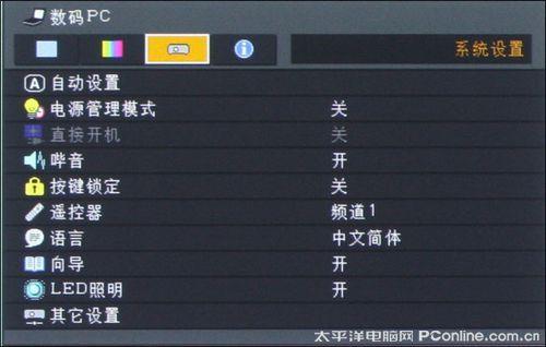系统设置选项可以对机器一些细节经行调整,如开启电源管理模式、菜单设换的bibi声、按键锁定功能、投影机菜单语言、机器LED照明功能等等。