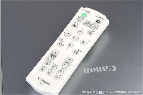 佳能WUX10随机附送的遥控器功能也相当的齐全,具备自动设置、信号源设换、画面定格、自动对焦、放大缩小、梯形校正、黑屏、静音等功能。在关灯情况下遥控器还要发出绿色的荧光效果,非常的人性化。
