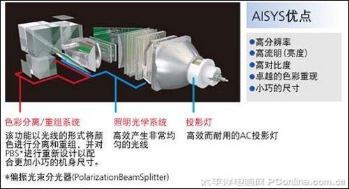 WUX10采用佳能专利的AISYS(Aspectual Illumination System)光学系统,这个光学系统可以使投影灯透射出的光线更加均匀,能够充分发挥出LCOS的潜能,AISYS光学系统独立控制光源发出的垂直和水平方向的光线,将垂直方向光线汇聚以提高亮度,并且把水平方向光线转化为平行光束以防止漏光,这使得LCOS投影机机身小巧却能够投射出高亮度和高质量的影像。