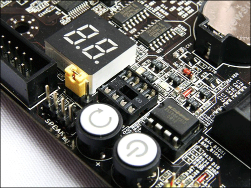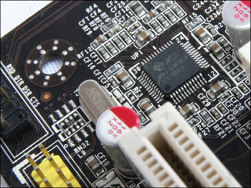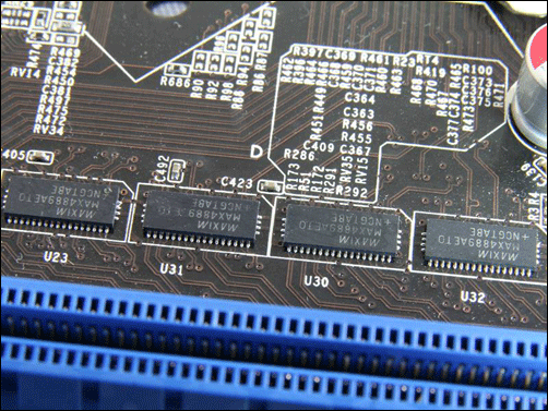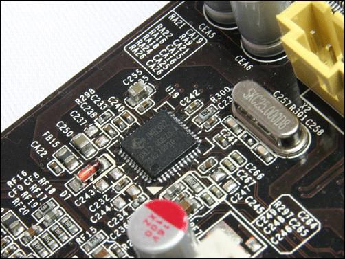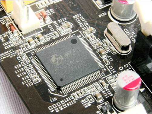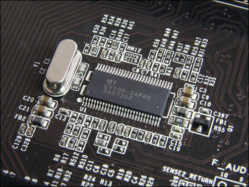 位于两个PCI-E插槽中间的IDT频率控制芯片,它的右边是一颗无源晶振。完全支持SetFSB软件调节。IDT频率控制芯片也被广泛使用在各种能够支持Windows超频的高端主板上,精准的频率控制和调节,能够令其为超频用户带来更为强大的超频体验。