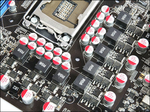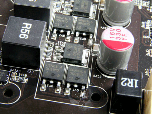 近看供电部分,每相供电采用了三个MOS管,MOS管为英飞凌的产品,性能比较优秀。电容则是来自我国台湾省的万裕固态电容。万裕电容已经在公版显卡中展露过身影,在盈通蓝派X58主板上也使用了这款电容,性能表现还是令人满意的。