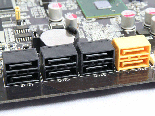 JMB363芯片,除了提供额外的IDE接口外,还为主板带来了两个SATA接口。黄色的两个SATA插槽正是由这颗芯片提供。