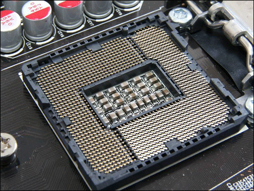 LGA 1156的插座,长方形设计。下一代AMD和英特尔的CPU都可能改为长方形外观了。