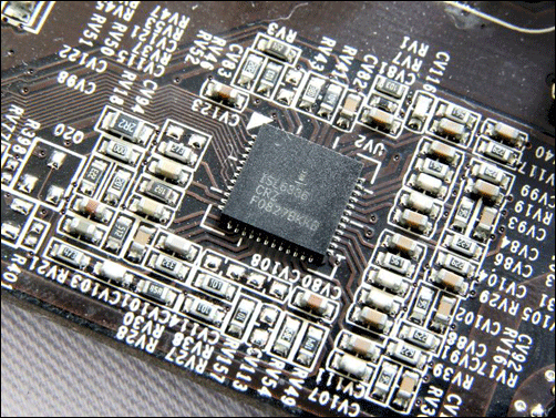 CPU核心供电部分主控PWM芯片为Intersil ISL6336 PWM IC,完整支持六相供电方案,支持英特尔最新的VRM 11.1规格,具有自动调整供电相数的节能功能。ISL6336通过采用连续检测输出电流的专利技术,可以满足新型微处理器对严格的稳压输出电压位置的要求。这些控制器可以测量输出电感器或专用电流检测电阻器DCR两端的电压,为精确压降、通道电流平衡和过流保护提供所需的信号。