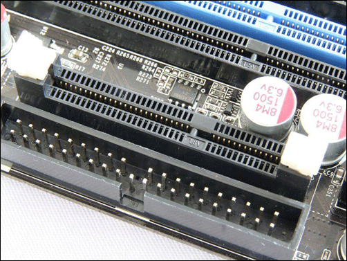这款主板支持双PCI-E X16,也可以在使用CrossFire X时自动切换为双PCI-E X8模式。主板PCI-E槽中间的四颗PI2PCIE芯片,自动切换PCI-E插槽配置,无需人工设定。