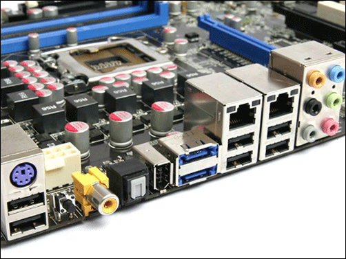 主板背部接口全家福,盈通P55提供了多达6个USB接口,两个E-SATA II接口、IEEE 1394、SPDIF、光纤接口、双千兆网卡、7.1声道音频、CleanCMOS等各种齐全的接口和按键。