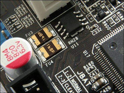 注意到那两个黄色的元件了吗?这是盈通特别为P55主板配备的保险丝。这种保险丝一般设计在比较危险的外接接口附近或者重要芯片附近。比如图中的保险丝就是为了保证USB接口安全,不会由于USB设备的问题导致主板南桥烧毁。除了在USB上,在供电部分、键鼠接口附近都会看到这种保险丝的身影。