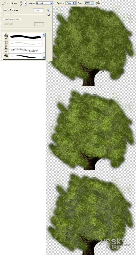 选择橡皮擦工具,选择下图左上角的自然笔刷形状,在树冠边缘擦出自然的状态,如下图。