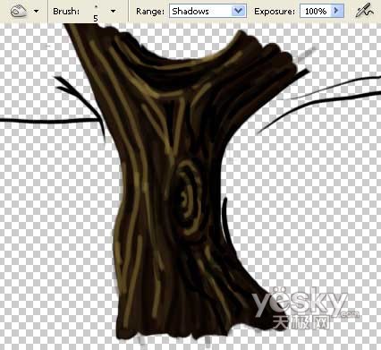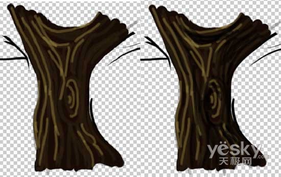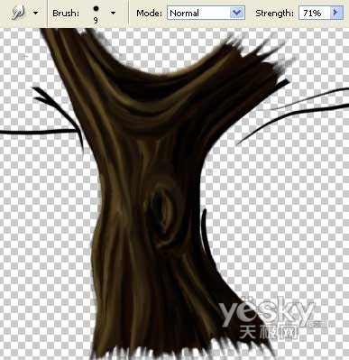 选用涂抹工具,采用较大的笔刷尺寸,在树干底端擦出树根的形状。