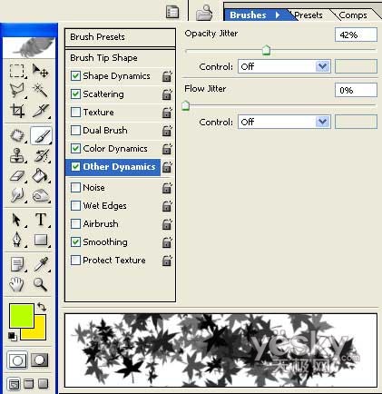 选择树叶形状的笔刷,做下图设置。并选择前景色为亮绿色,背景色为深黄色。