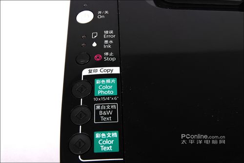 操作按钮和指示灯设计在正面左侧,指示灯简单明了,两盏指示灯分别显示缺纸、卡纸等和缺墨、墨尽等异常状态;停止按钮负责停止当前打印任务、更换墨水、移动墨车等功能;停止键下面三个就是一键复印按钮,分别对应彩色照片、黑白文档、彩色文档三种文件的复印,用户根据复印的文档的类型进行选择,非常方便。