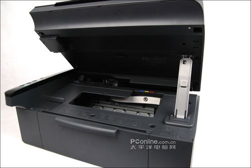 打开上盖,我们可以看到爱普生ME360的扫描仪单元,其使用CIS平板式扫描元件,光学扫描分辨率为600×1200dpi,具有48位输入和24位输出色彩深度。