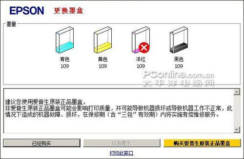 当洋红墨盒用完后记下当前打印页数,更换全新的洋红墨盒继续打印,直到另一颜色墨盒耗尽,然后重复上一步骤,直至4个墨盒均消耗完1次。