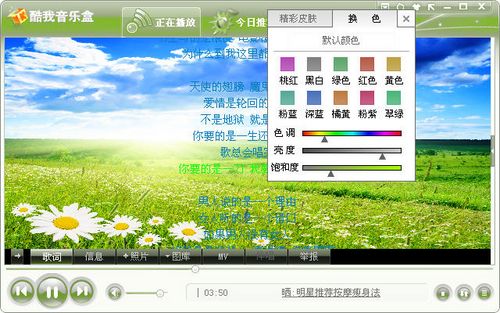 先选择一个自己喜欢的皮肤样式,然后在播放器窗口右上角点击“换肤”按钮切换到“换色”窗口,在这里你可以对当前皮肤的色彩,亮度和饱合度进行手动调节,根据自己的喜好将播放器窗口皮肤调整为需要的样式,这样无论你对皮肤界面有什么样的要求都可以轻松实现了。