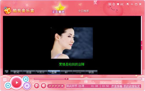 大家对于自己喜欢的歌手都会钟爱有加,会收集和歌手有关的一切东西。酷我音乐盒为了满足用户们对于歌手的热爱,让用户更贴近自己喜欢的歌手,还特别推出了专为明星定制开发的皮肤。比如以歌坛新宠金莎形象为外形的播放器皮肤,这也是酷我音乐盒独家首推的第一款明星皮肤。在皮肤界面上以专辑主打歌曲为Logo,配以明星写真造型和精美的卡通按钮等,为用户们呈现了一个时尚靓丽的明星形象。对于喜欢金莎的歌迷来说,看到这样的皮肤无疑会感到非常亲切。对于明星的粉丝们来说,明星皮肤无疑会是最佳的选择。