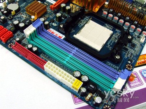 双敏UR790GX主板内存部分,虽然产品采用了小板型的设计方案,但考虑到用户以后的升级需求,产品依然提供了4条DIMM内存插槽,支持双通道DDR2 1066/800内存规格,最大支持16GB容量。