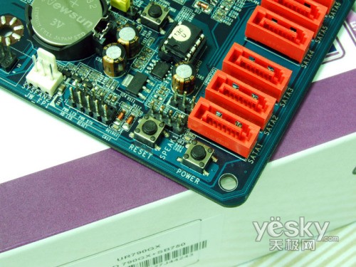 双敏UR790GX主板磁盘接口部分,通过SB750南桥提供了6个SATAⅡ磁盘接口,可以组建多种RAID磁盘阵列模式,满足主流用户的扩展需要。此外还提供了一个IDE接口以及一个eSATA接口,为用户升级提供了足够的施展空间。值得一提的是,在磁盘接口下方整合了power、reset快捷按键,对于裸机的玩家带来不少的便利。