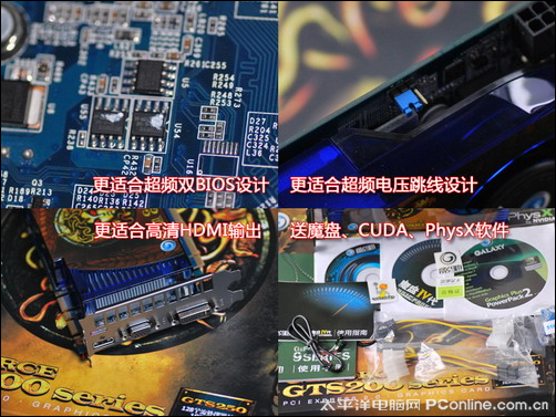 大家可能都知道影驰显卡玩家功能,在这款更高档的显卡上自然玩家功能不会少。显卡采用了最新的第三代双BIOS,操作更方便、更安全;采用了电压跳线,可以提升显卡超频潜力;结合功能强大的魔盘,显卡可玩性更高。不仅仅这样,作为HDMI协会会员的影驰,还为这款高档显卡搭配了更适合高清的HDMI接口。在软件方面,显卡提供了基于CUDA、PhysX的应用软件,可以让显卡更好玩、更实用,体验更真实特效,利用率更高。