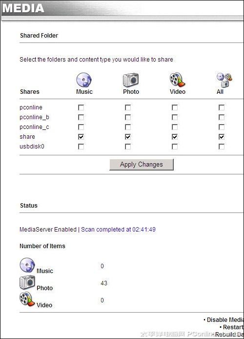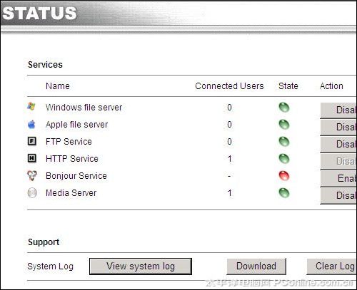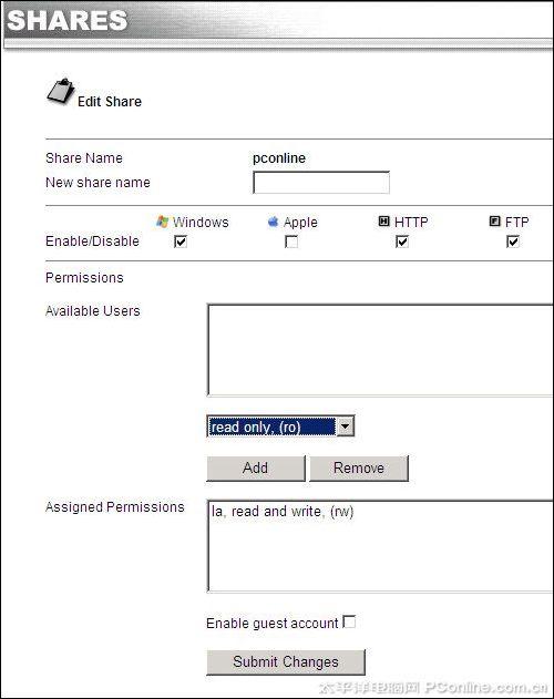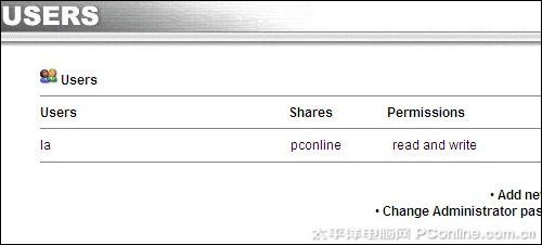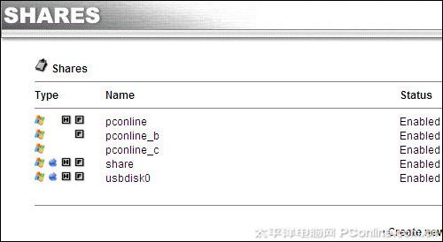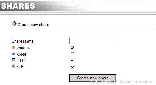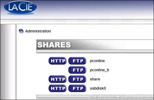 EDMini的管理主页主要分为两部分,一、用户可以点击Administration进入配置页面,二、在下面的SHARES区域中,列出了所有共享文件夹,用户可以点击HTTP或FTP直接访问文件夹中的内容。细心的网友可能发现了,为什么pconline_b没有HTTP按钮?EDMini共支持四种访问方式,分别是HTTP、FTP、Apple、Windows。用户在创建共享文件夹时可以进行指定。