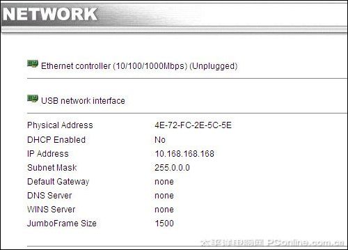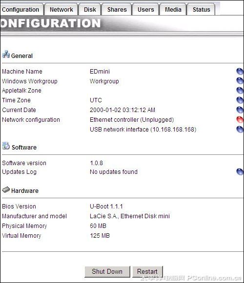 EDMini的管理功能很简单,共分为七个标签。在Configuration标签中,用户可以修改EDMini的网络名称,使用这个名称,在IE中可以直接进行登录;还可以修改系统时间、配置网络地址、查看设备软件版本。