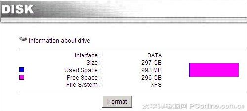 EDMini硬盘管理页面,可以看到硬盘容量、使用状况等信息。在这里还可以对硬盘进行格式化。慎用此功能,格式化后,硬盘上原有数据将被全部清空。
