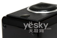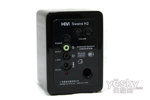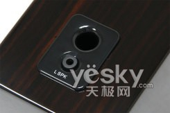 惠威H2背部:音量、开关按键式设计,尽管未使用旋钮方式,音量操控还是比较好用的。首先,音量+和音量-的按键是凸起和凹入,通过手感就能执行大脑的命令。其次,关机后,出于保护的目的,音量会归为低位。副箱背部为3.5mm功率输入插座,由主箱一线输出至副箱,方便用户连接和摆放。