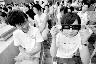 关于观看日全食的准备工夫,赵君亮反复提醒,除了全食阶段的5分多钟外,其余时间一定不可用肉眼直视太阳,普通墨镜也不管用。使用照相机、摄像机或望远镜,也一定要加上专门的滤光装置。如果买不到专业的日食观测眼镜,可尝试用多张深黑色的X光片或曝光过度的黑色底片叠合在一起,但滤光效果是否合格,还需试验。市民也可自己制作投影成像装置,如取两张纸板,一张穿一小洞,另一张放在后部合适位置上,使太阳投影像清晰呈现在纸板上;也可用镜子把太阳小孔像反射到白色墙面上。