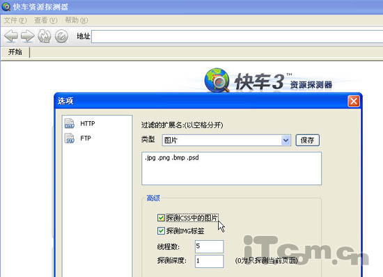 最新版的网际快车FlashGet3.1下载软件,其中有个“资源探测器”功能,就可以帮助我们实现CSS图片的探测和下载保存。如图01所示,打开快车资源探测器后,从“文件”菜单下选择“选项”命令进入,然后在“高级”选项栏中勾选“探测CSS中的图片”。