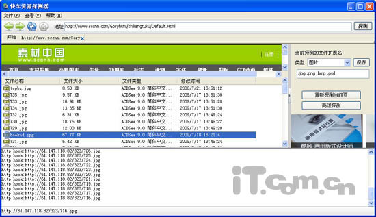 接下来在资源探测器页面的地址栏中输入要下载网页地址,单击右方的“探测”按钮,稍等片刻即可搜索得到此网页中的所有图片地址了,如图02所示;然后再利用快车软件麻利的下载即可。