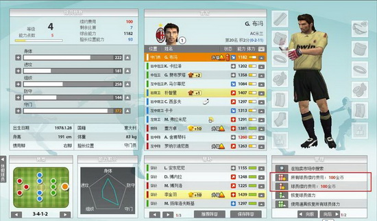 再看这里,布冯的综合能力值较低,所以他的续约费用只有100金币。而且这支球队高能力值的球员很少,全队的续约费用也就不高咯!