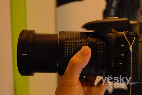 为了获取更高的闪灯挑高,我们可以看到机顶灯合下后,向前伸出很多整个灯头基本都是裸露在外面。对于这样的“大镜头”产品来说这也是必须的措施,以免出现镜头遮挡闪光的情况。
