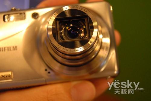 F75EXR的镜头配置为f = 5.0 至 50.0mm,相当于35 mm相机的27 mm至270mm。高达10倍光学变焦的镜头搭载在如此小巧的机身上,不得不令人赞叹富士的鬼斧神工,应该说他是同等级变焦机型中最小巧的一款。另外27mm的广角对于不少用户来说也是令人惊喜的消息。