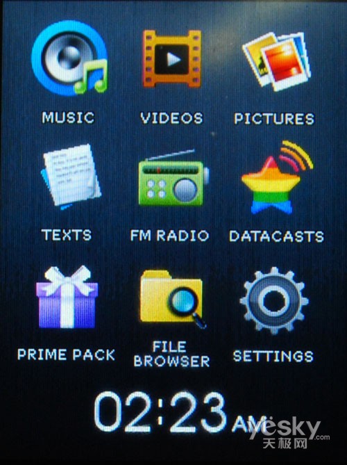 三星YP-CP3的操作界面采用了九宫格设计,只要轻触机身的LED触摸键就可以轻松操作,通过操作界面我们可以看到,三星YP-Q2有视频、音频、图片、文本、收音机、数据库、百宝箱、资源管理器以及设置几大功能,下面,就让我们带大家来看一看三星YP-Q2。