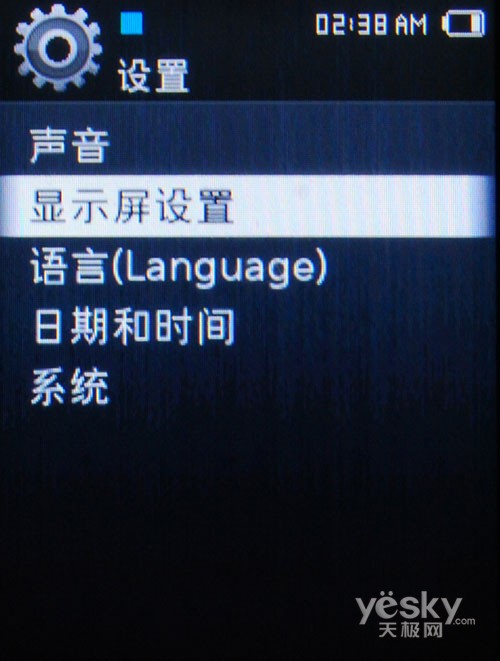 在设置功能里,我们可以进行声音的设置,声音设置里面主要是主EQ的设置比较有用;而显示屏设置可以设置皮肤、屏幕关闭时间以及亮度,在语言选择菜单里,可以选择英韩法德意日等多国语言来显示菜单以及内容;时间功能里,可以调节日期和时间,并且可以选择世界各地不同的时区;在系统菜单里,可以进行我的信息编辑,休眠、电源设置,初始化和格式化操作,以及系统信息的查看。