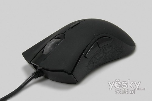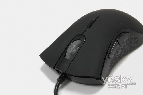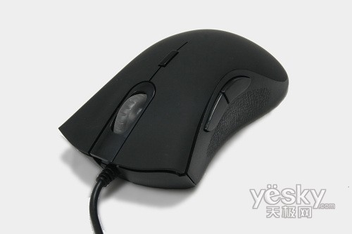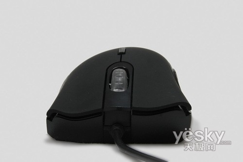 优派变速神鹰用了一个透明的滚轮,加点小横纹,看起来很并不突出。但是一旦开机,让滚轮发出光来以后,感觉就完全不同了。淡淡的光线通过透明的滚轮折射出来,有种很上档次的感觉。而光线还体现出了鼠标目前的DPI速度。比如红色是 1600DPI.淡黄色是400DPI.感觉相当不错。而大波浪型的按键设计,和略微上扬的鼠标前端。怎么看都和RAZER有点相似,鼠标上盖的弧度更适合国人,握起来也更舒适。手腕,食指,中指都相当舒服。