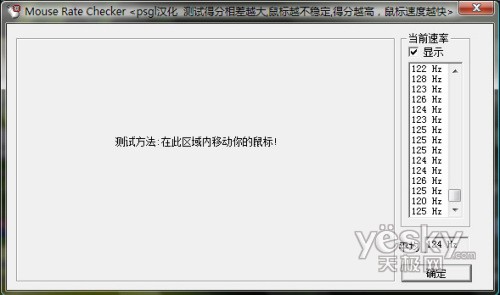 Mouse Rate Checker的平均频率是鼠标在移动时所有频率的平均值,它可以从单方面来反映鼠标的速度快慢,而白色框中不断变动的数字便可以看出鼠标的稳定性。得分相差越大,表示鼠标越不稳定,得分越大,表示鼠标速度越快、性能越好。而在理论测试中优派变速神鹰的表现可谓非常出色,轻松达到124Hz的平均值,表现相当优异。