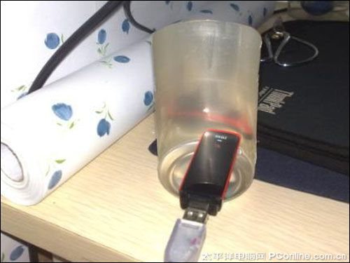 用USB延长线把3G上网卡接出来,放到剪好的易拉罐中