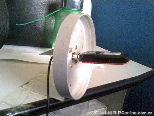 如果说刚才的易拉罐天线近似玩具,而且不美观,那就请看看接下来这个由网友syll2001制作的3G定向天线吧,这部定向天线是利用铝合金锅盖改装而成的,关键材料是锅盖,我们在它的中间位置钻一个刚好能通过USB延长线接口的孔,在锅盖背面用长镙丝和有机玻璃把USB延长线的接口固定死,不让它能晃动。
