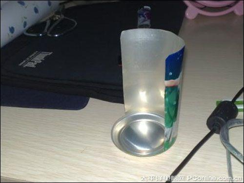 看到了嘛。一个易拉罐就可以做成简易的3G上网卡的反射板天线,这块反射板能将更多的信号聚集起来让3G上网卡接收到,而且成本低。此天线的关键问题是要找准焦点。找到焦点后把3G上网卡放在该位置,用胶将其固定住。