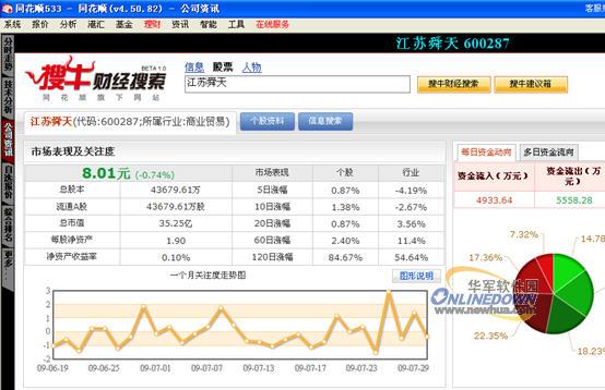股民还可以点击搜牛搜索框上面的“股票”菜单,查看该股的“市场表现”“关注度”“每日资金流向”“多日资金流向”“行业动态”“机构研究”等分析个股非常有价值的信息。上述功能实现也都不要单独新开浏览器,在同花顺2009免费客户端里面直接查看和切换,可谓方便快捷,具体界面可参考如下图4:
