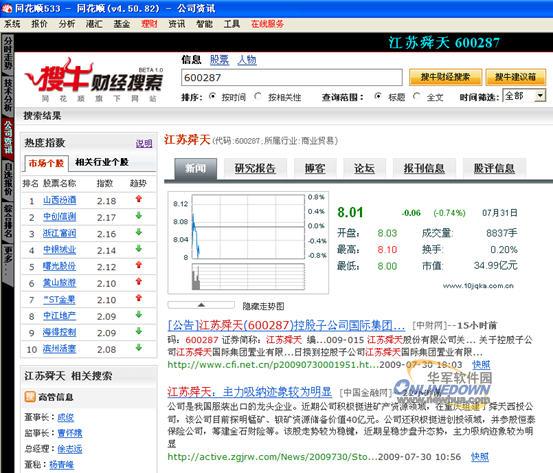 如何找到同花顺搜牛?目前有三个入口,第一是用户直接输入搜牛通用域名:http://search.10jqka.com.cn/,第二是用户在同花顺金融服务网首页点击财经搜索框,输入上市公司股票代码后即可进入搜牛。上述两种都是基于网页浏览器进行的搜牛财经搜索,下面重点介绍第三个访问搜牛途径,在软件里直接访问搜牛,股民只要打开一个同花顺客户端即可实现炒股的看盘,资讯,委托,搜索的全部需要。下面笔者就带大家一起去同花顺2009免费客户端里去体验专业财经搜索的搜牛的强大功能吧!