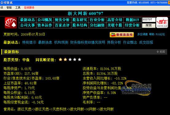 首先在软件里面F10切换到个股资料界面,在软件右下角切换到“同花顺F10”按钮,如下图2浙大网信的个股完全资料所示: