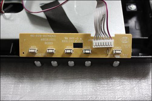 显示器电源按钮线路板上,我们能够看到“ROHS”环保设计,背面焊点饱满做工地道。