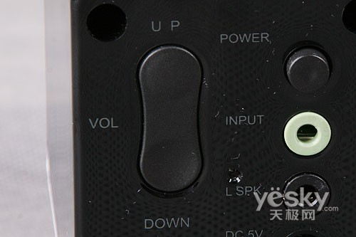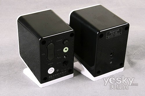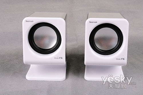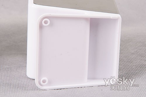 甲盾F6 的细节部分有一些是笔者比较欣赏的,例如V字形的支架设计,这种时尚的韵味很难用言语来去阐明,不过见到它时,你却又能真真实实地感受到。不过稍感可惜的是,甲盾F6的底部并没有提供垫子,这样纯塑料的底部在一些摩擦系数并不高的桌面等处很容易滑动,且也不利于固定,无形中对音箱的安全及音质也是有一定潜在影响的,希望其零售版本会有这样的设计吧。